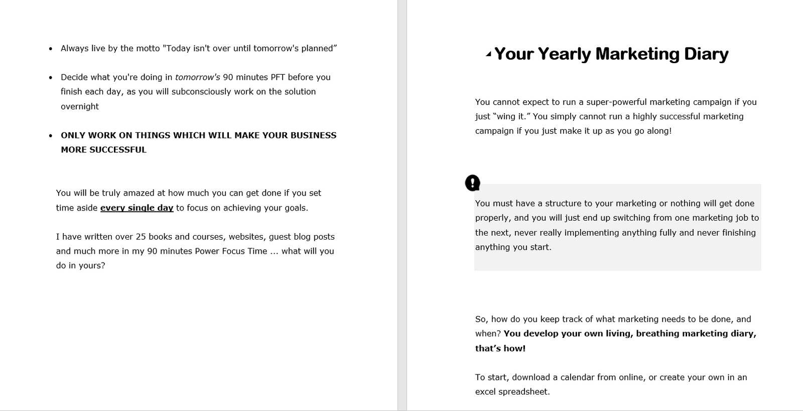 Day 1 is all about helping you set up your marketing system and organise your marketing properly so everything gets done, when it needs to be done.